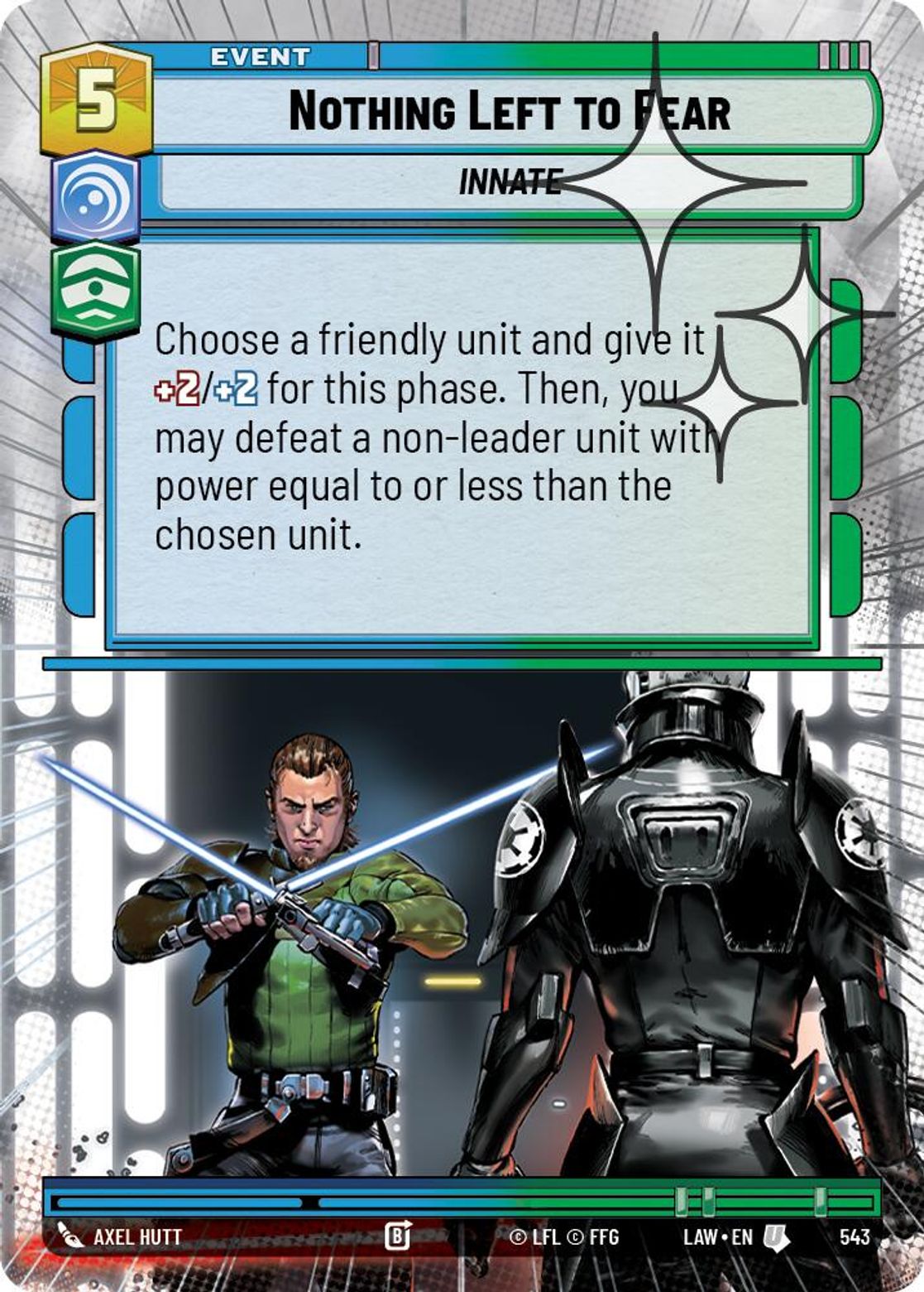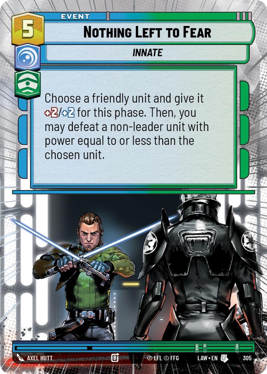 Choose a friendly unit and give it +2/+2 for this phase. Then, you may defeat a non-leader unit with power equal to or less than the chosen unit.